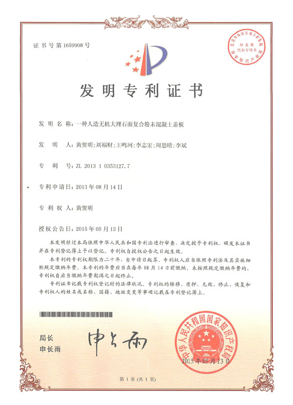 一種人造無機(jī)大理石面復(fù)合粉末混凝土蓋板專利證書
